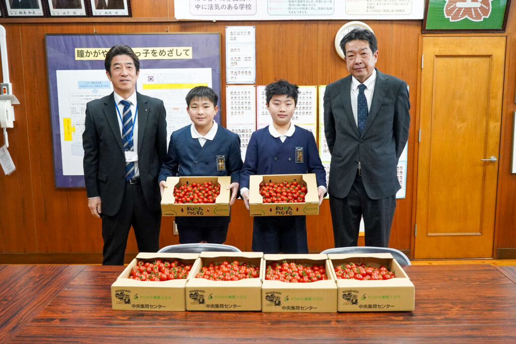 2月18日には、ミニトマトの贈呈式を玉名市立玉名町小学校で開きました。JA園芸部連絡協議会ミニトマト専門部の宮津拓次部会長が「私たちが大切に育てたミニトマトを食べてほしい」と手渡しました。児童代表の村上秀仁さんと宮尾結人さんは「たくさんのミニトマトをありがとうございます。トマトには生活習慣病の予防になるリコピンが含まれているとネットで調べて分かった。いっぱい食べて丈夫で健康な体を作りたい」と話しました。