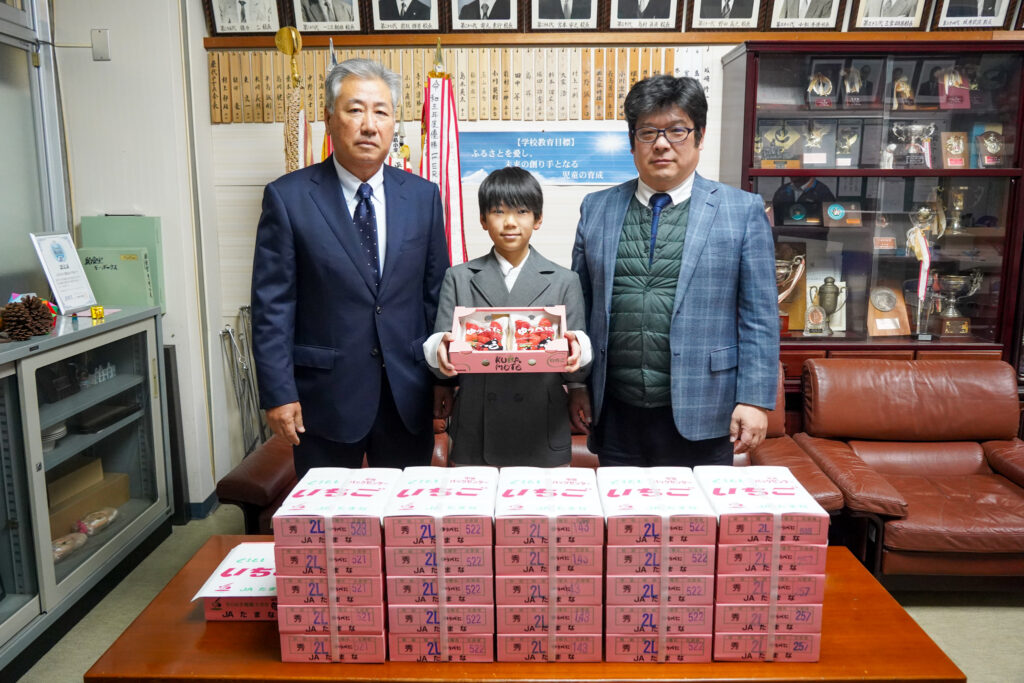 2月5日、イチゴの贈呈式を玉名市立横島小学校で開き、JA園芸部連絡協議会イチゴ専門部の宮尾太部長が「丹精込めて作ったイチゴを食べてほしい」と手渡しました。受け取った児童代表の園田煌太さんは「玉名で取れる甘くておいしいイチゴが大好き。給食で食べるのが楽しみ」と感謝を述べました。