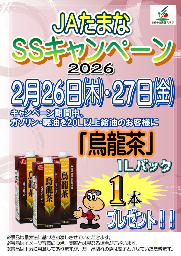 JAたまなでは、2月26日(木)と27日(金)の2日間、管内のガソリンスタンドで「SSキャンペーン」を実施します。